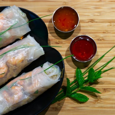 Rapsakoita kevätrullia täytettynä tuoreilla kasviksilla ja herkullisilla kastikkeilla.
